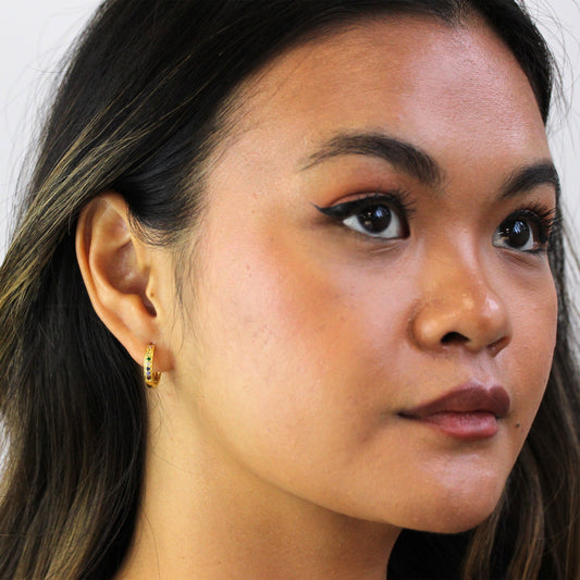 Boucles d'oreilles Huggie en argent sterling plaqué or avec zircones cubiques arc-en-ciel de 13 mm