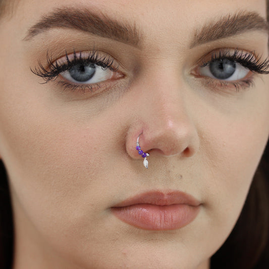Prix habituelAnneau de nez en or blanc 9 carats avec pierres d'opale violette et feuille de 10 mm