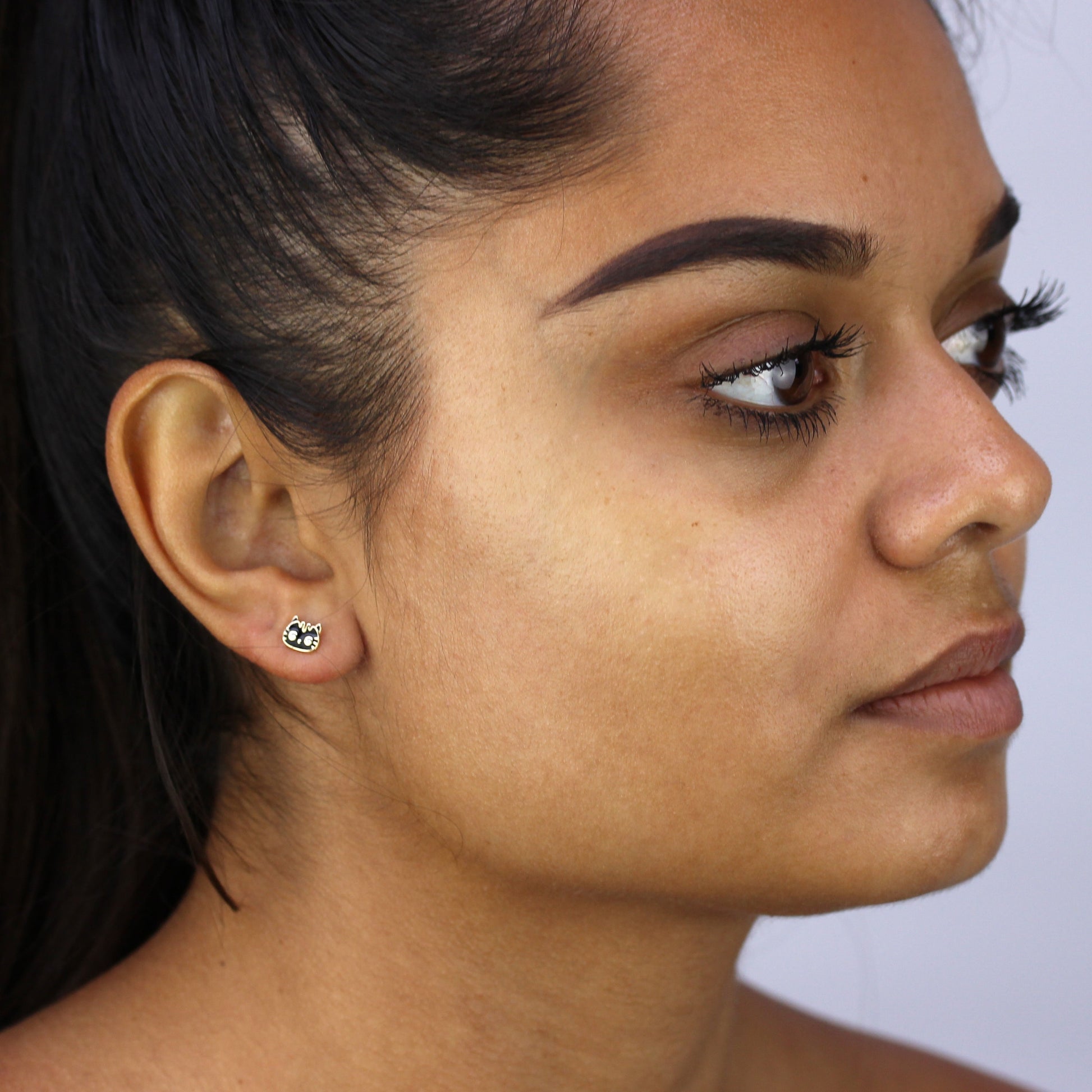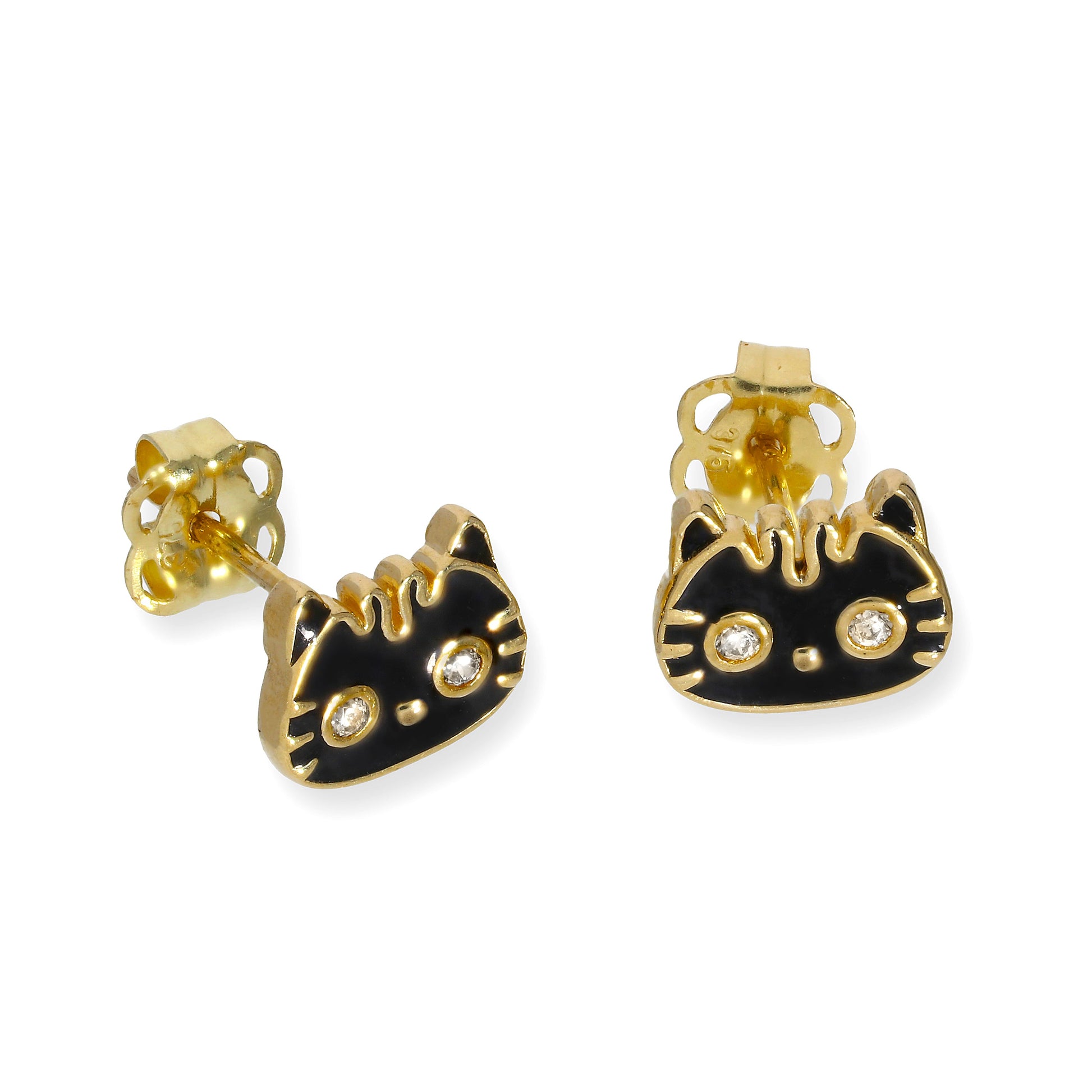 Boucles d'oreilles à tige en or 9 carats, émail noir et cristal CZ transparent, tête de chat