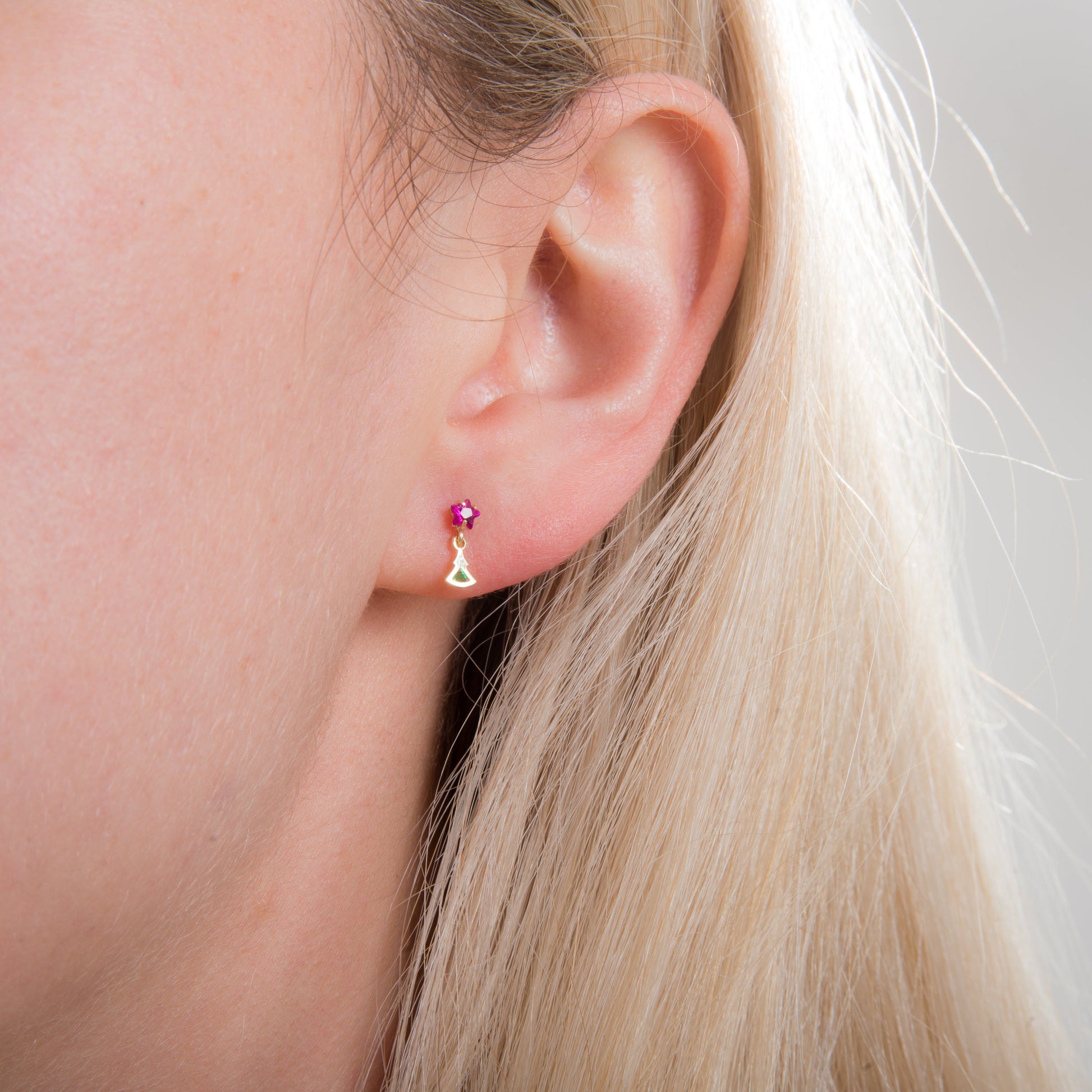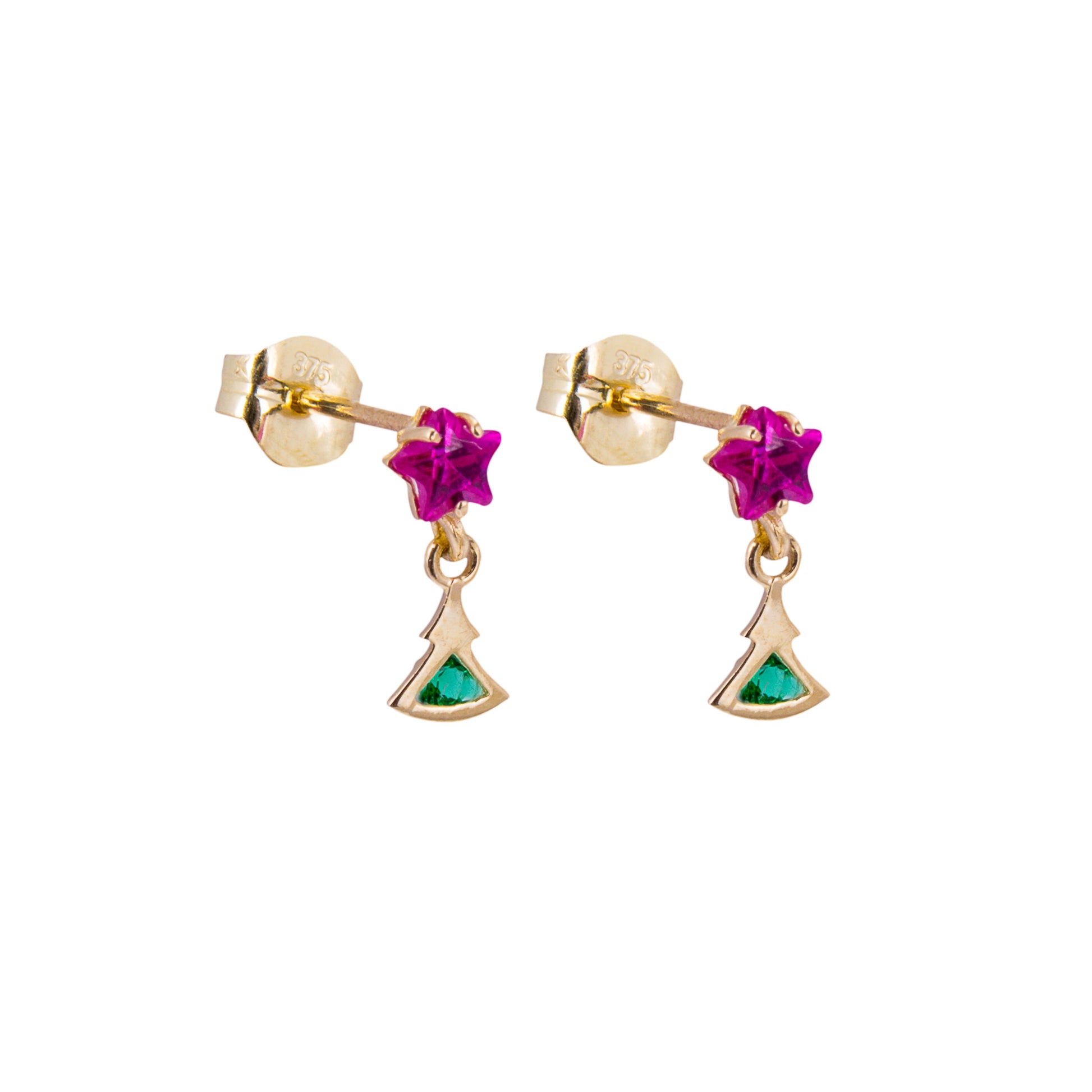 Boucles d'oreilles pendantes en or 9 carats avec sapin de Noël, vert émeraude, rubis, étoile rouge et zircone cubique