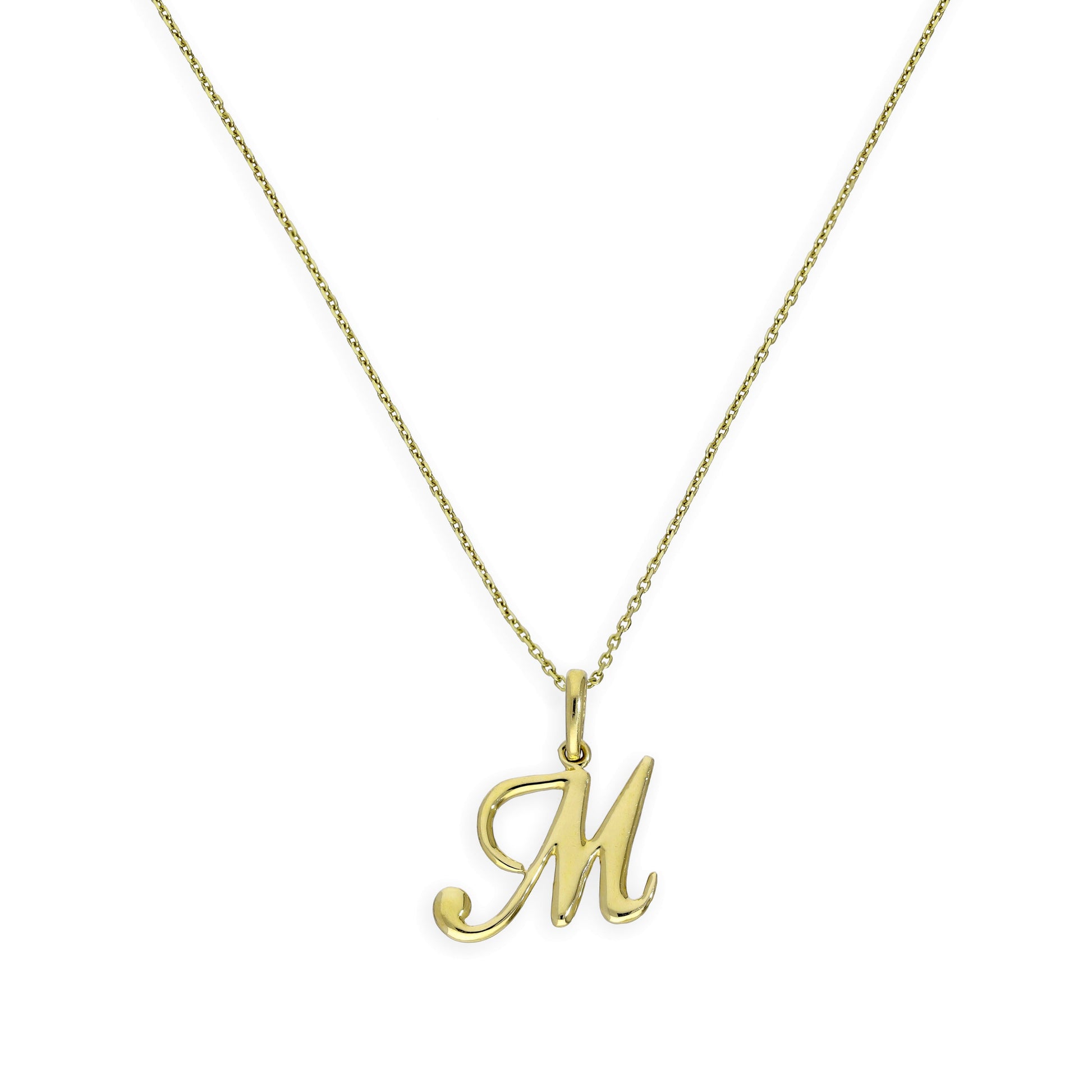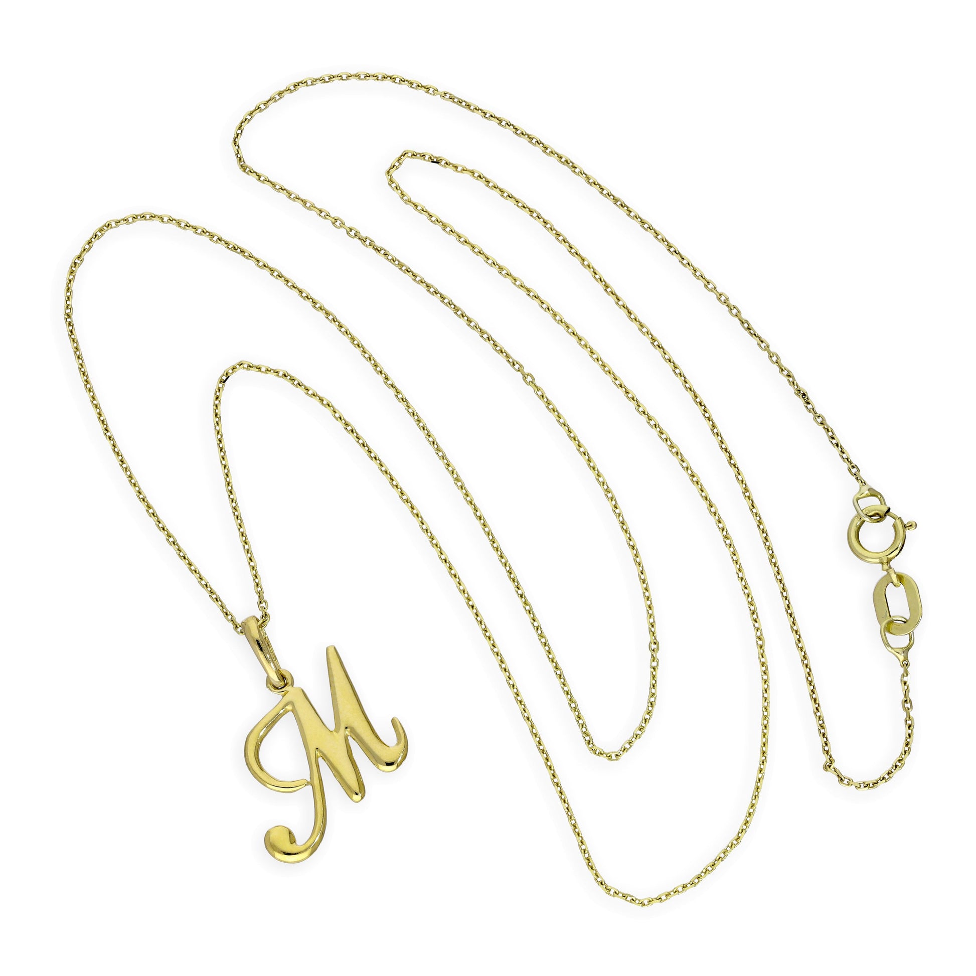 Collier avec pendentif en or 9 carats, lettre M, calligraphie fantaisie, 40 à 50 cm