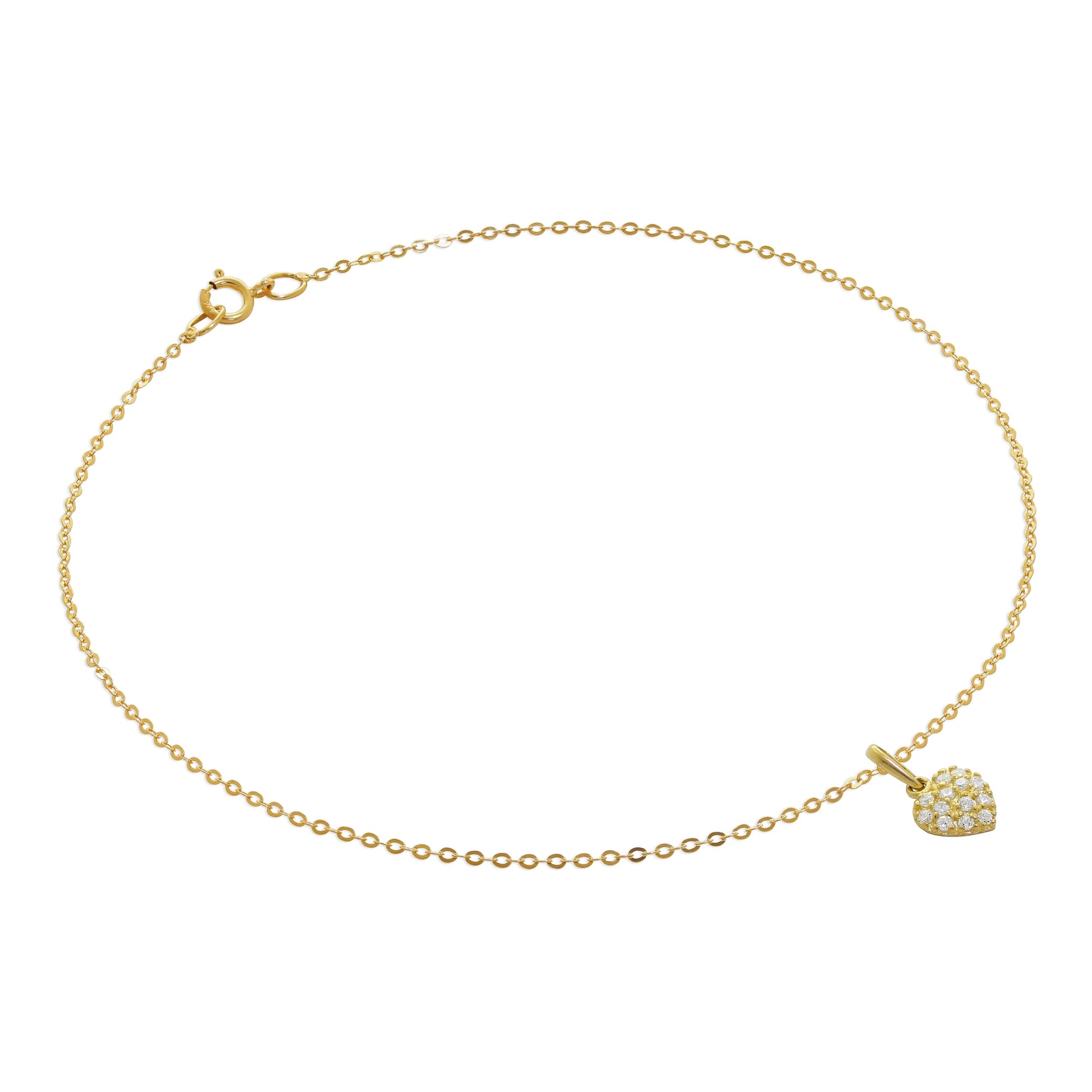 Bracelet de cheville martelé en or 9 carats avec breloque cœur en oxyde de zirconium plat - 9,5 pouces