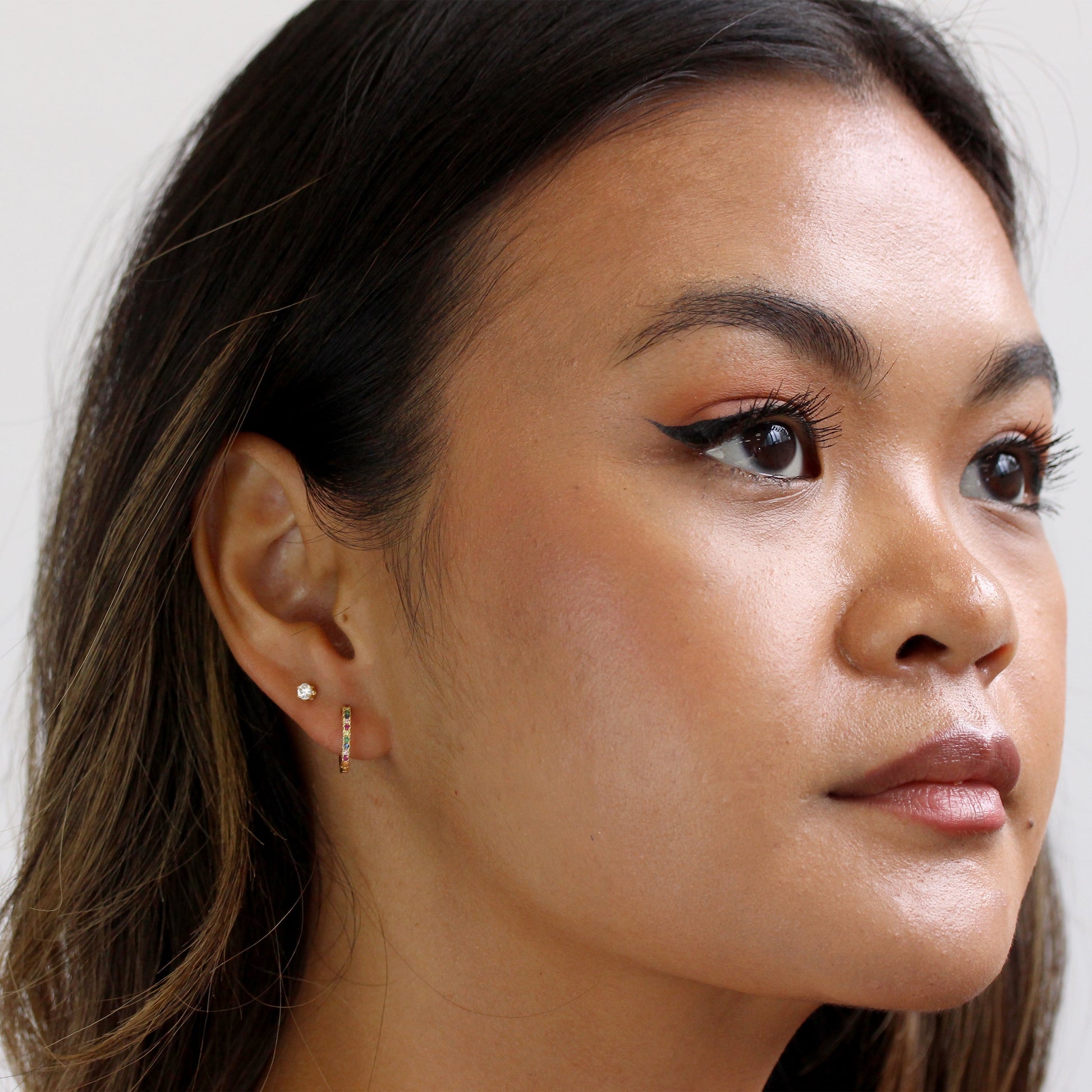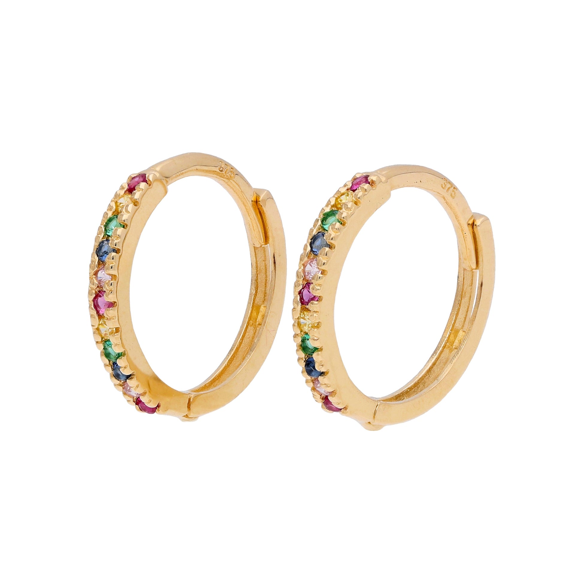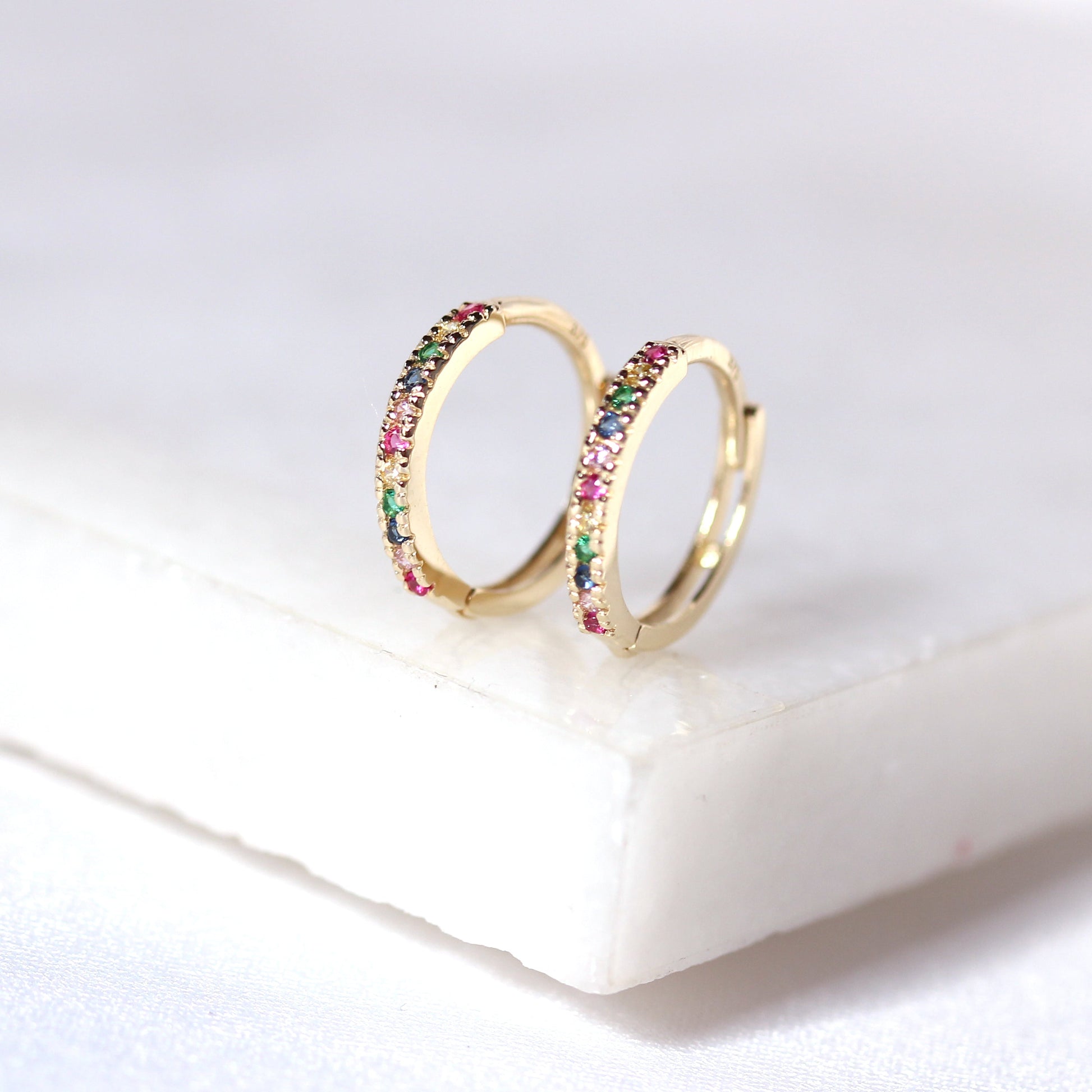 Boucles d'oreilles créoles Huggie 12 mm en or 9 carats avec zircones cubiques arc-en-ciel