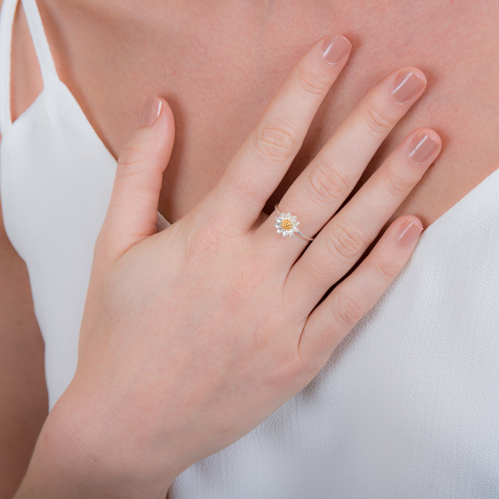 Bague ajustable en argent sterling plaqué or avec marguerite