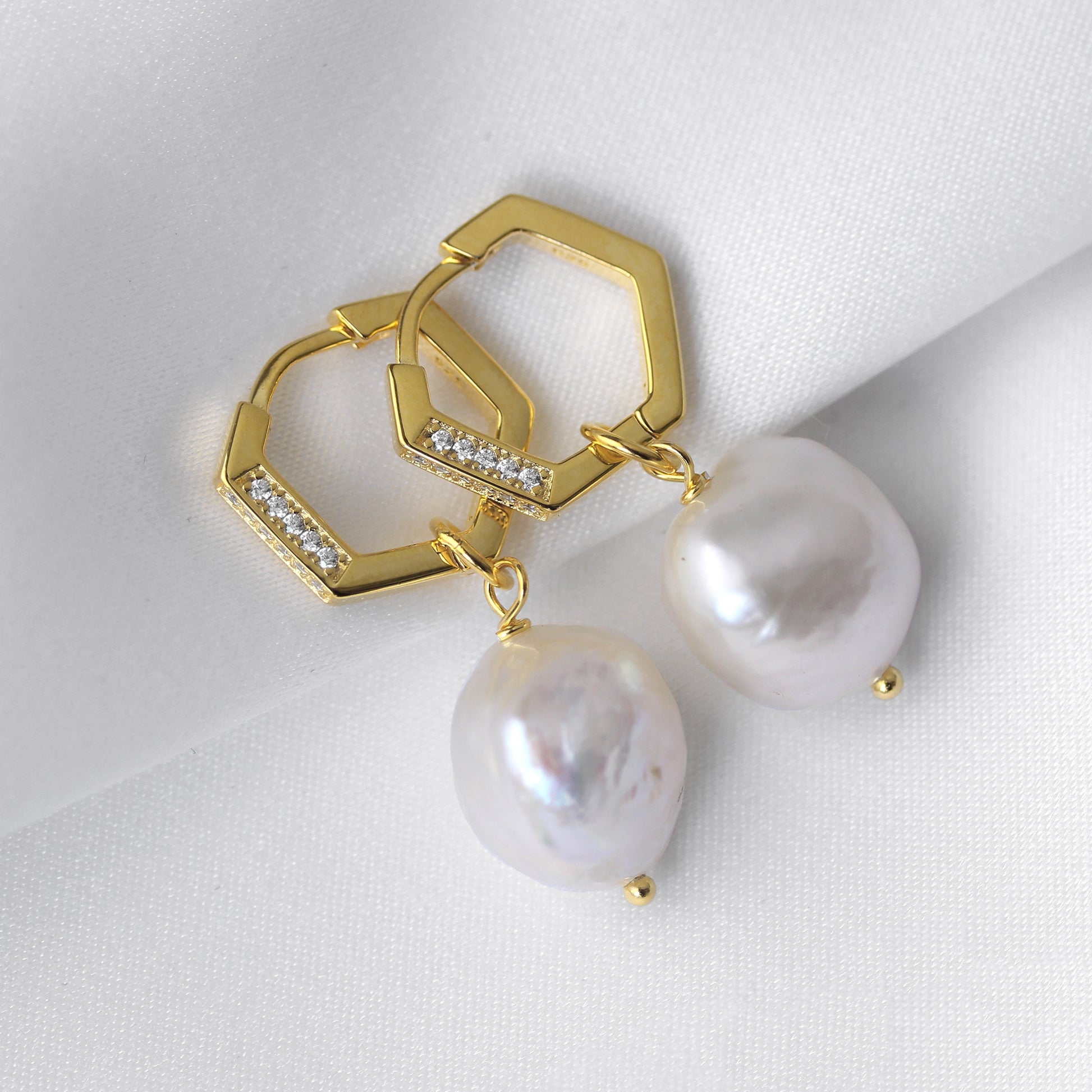 Boucles d'oreilles créoles en argent sterling plaqué or avec perles d'eau douce et zircones cubiques de 14 mm