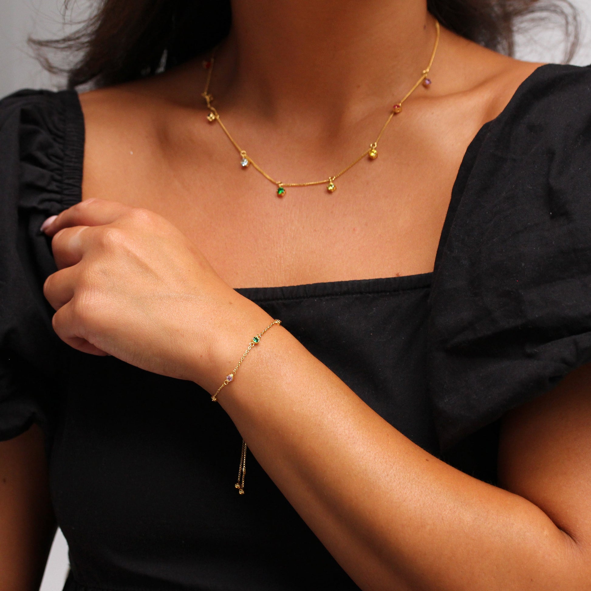 Bracelet réglable en argent sterling plaqué or avec plusieurs zircones cubiques arc-en-ciel
