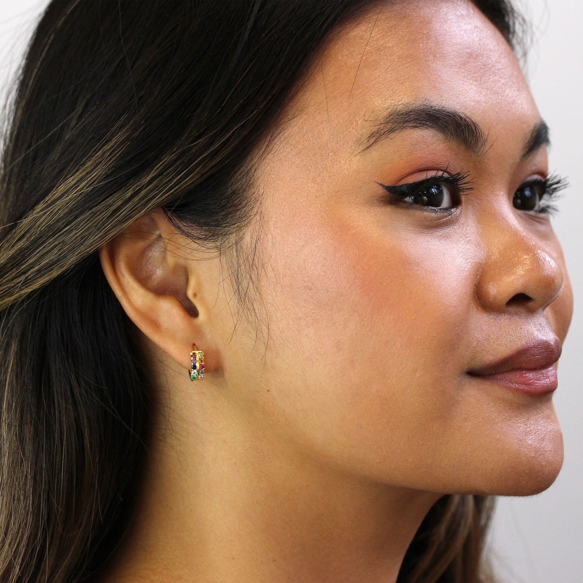 Boucles d'oreilles Huggie en argent sterling plaqué or avec zircones cubiques arc-en-ciel de 13 mm