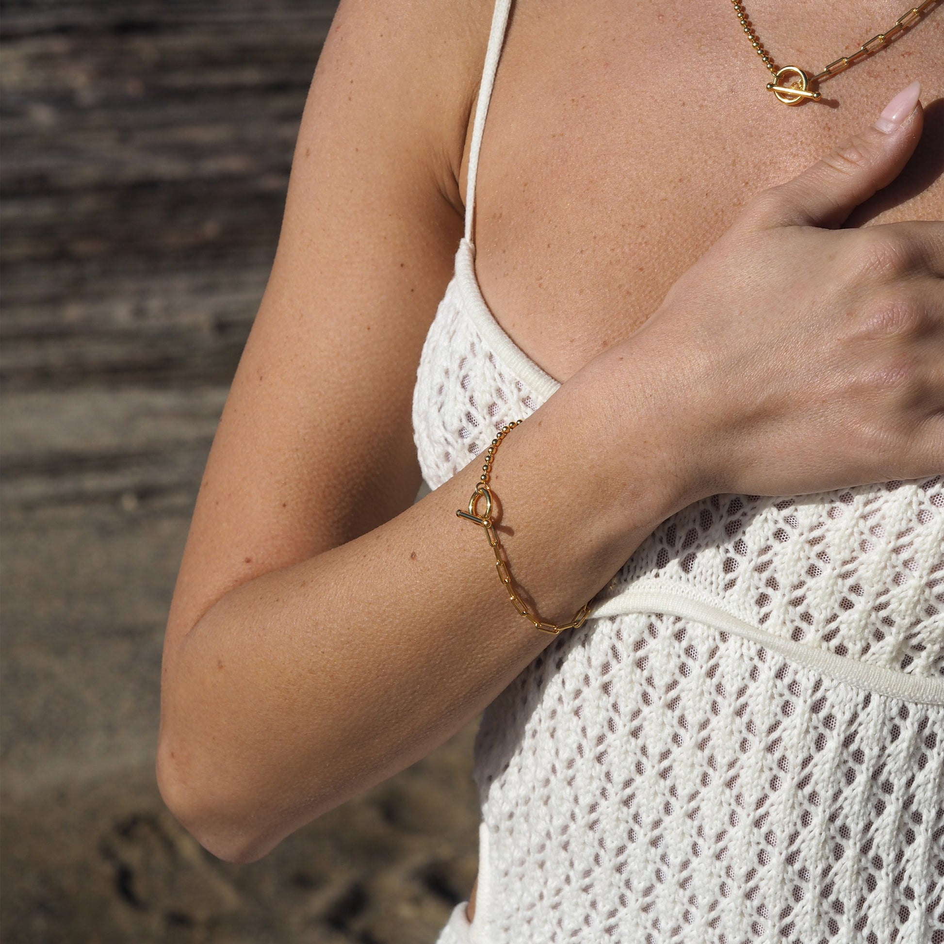 Bracelet chaîne à billes en argent sterling plaqué or avec barre en T et trombone