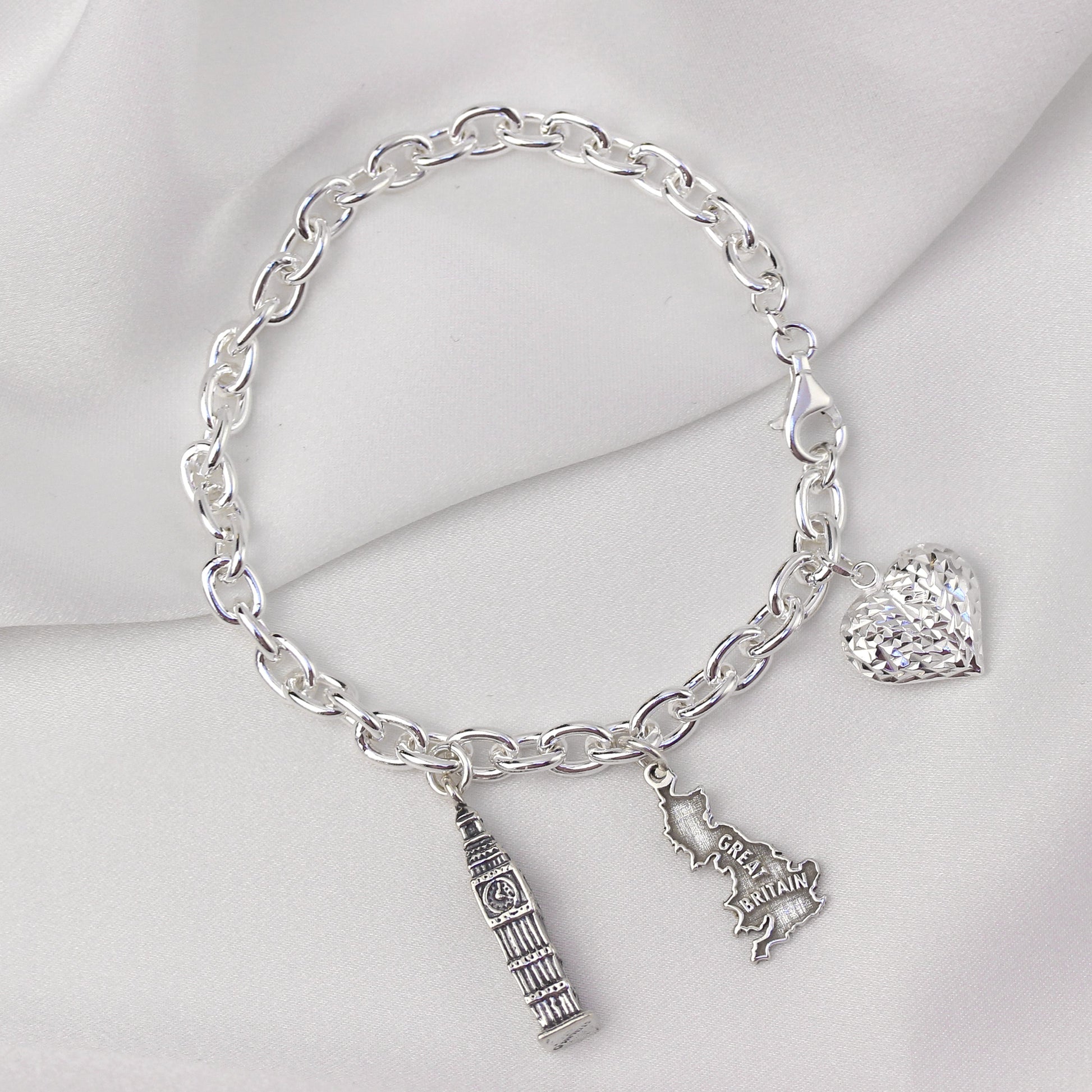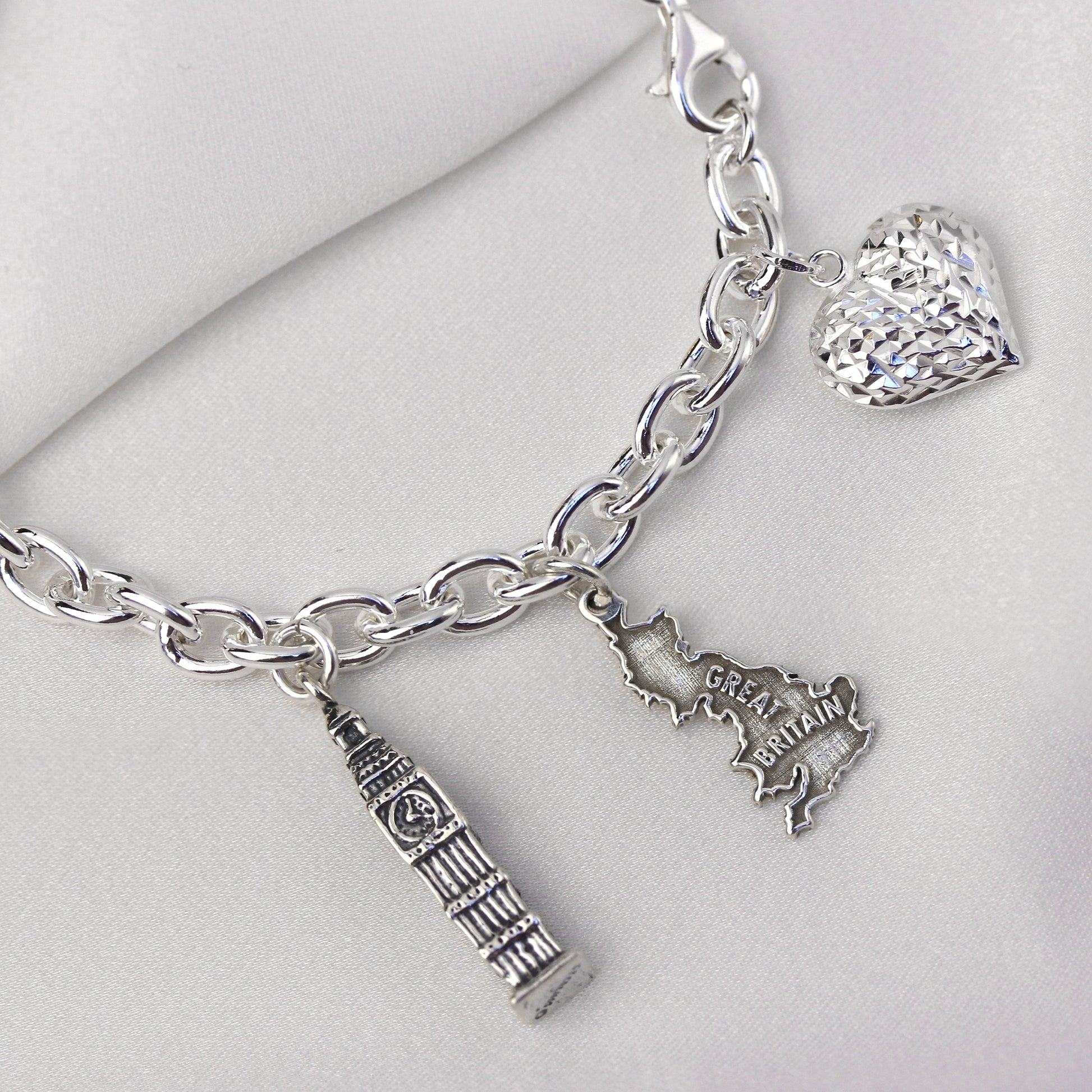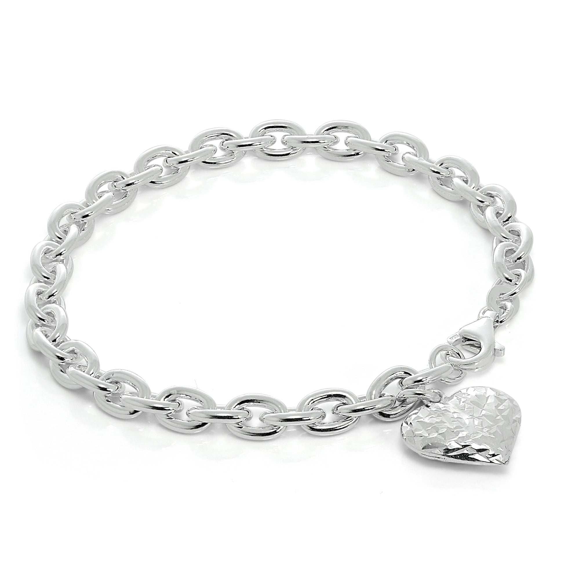 Bracelet à breloques en argent sterling massif avec breloque cœur bombé taille diamant