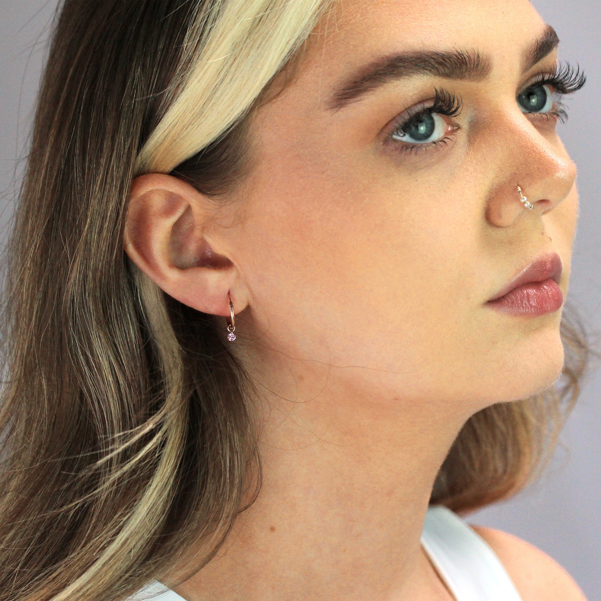 Boucles d'oreilles créoles en argent sterling plaqué or rose et cristal CZ rose de 3 mm