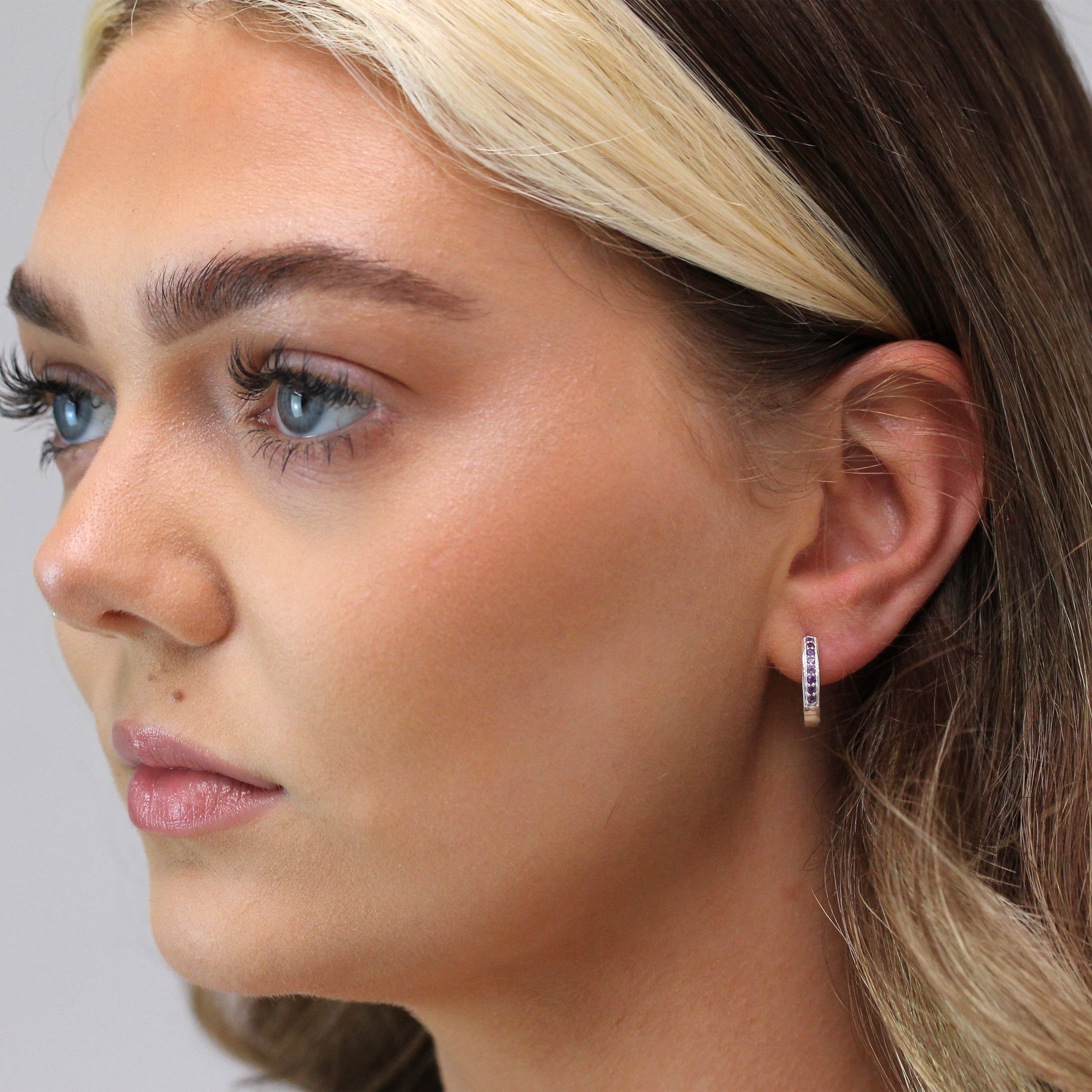 Boucles d'oreilles créoles en argent sterling avec améthyste et zircone cubique pavées de 15 mm