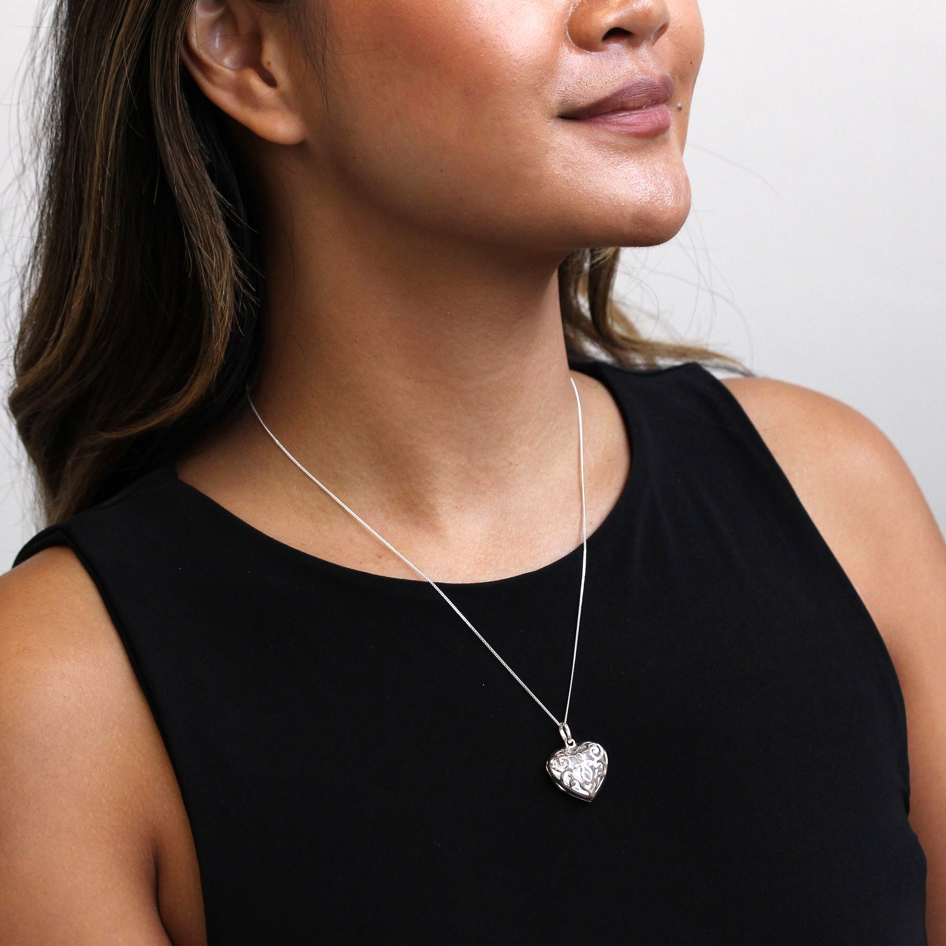 Médaillon en argent sterling gravable en forme de cœur avec motif tourbillons ouverts, 40 à 55 cm